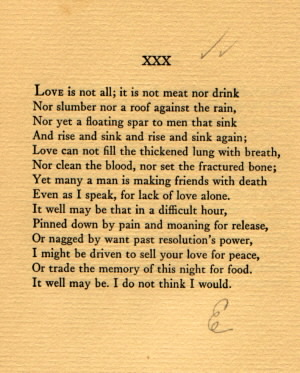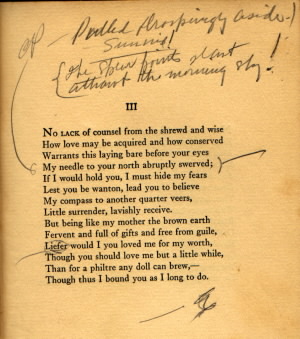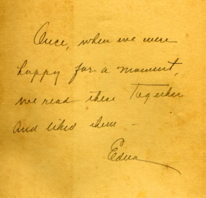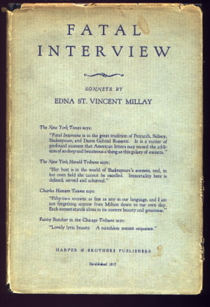 We had two little books by Edna St. Vincent Millay that appear to be inscribed by her to a friend. "Second April" has an unsigned poem on the flyleaf and no other pencil marks in it. This is the first printing of the Harper and Brothers edition. The actual first edition was published by another publisher. With the second book, "Fatal Interview", it appears that Miss Millay made some marks in it and then signed it with a sentiment and gave it to someone. Maybe we should have gotten the name of the person who had the garage sale.