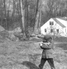 Getting serious with the wooden rifle my dad made for us. It would shoot big ol' rubber bands that we made from an old inner tube. |