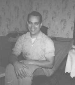 This is dad in 1959. He is sitting in that "ultramodern" contraption, the canvas sling chair. |
