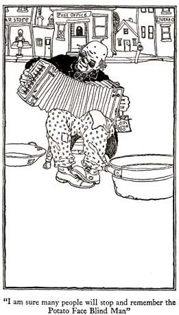 "Is there anything I can do?" asked Any Ice Today. "I do it myself," said the Potato Face Blind Man. "If I am too sorry I just play the sleepy song of the long wind going up the sleepy valleys. And that carries me away where I have time and money to dream about the new wonderful accordions and postoffices where everybody that gets a letter and everybody that don't get a letter stops and remembers the Potato Face Blind Man." ![]() |
