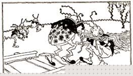 "Long agao," said the Potato Face Blind Man, "long before the necktie poppies began growing in the backyard, long before there was a necktie scarf like yours with the whiteface pony spots on a green frog swimming in the moonshine, back in the old days when they laid the rails for the railroad they laid the rails straight." "Then the zizzies came. The zizzy is a bug. He runs zigzag on zigzag legs, eats zigzag with zigzag teeth, and spits zigzag with a zigzag tongue. "Millions of zizzies came hizzing with little hizzers on their heads and under their legs. The jumped on the rails with their zigzag legs, and spit and twisted with their zigzag teeth and tongues till they twisted the whole railroad and all the rails and tracks into a zigzag railroad with zigzag rails for the trains, the passenger trains and the freight trains, all to run zigzag on. "Then the zizzies crept away into the fields |